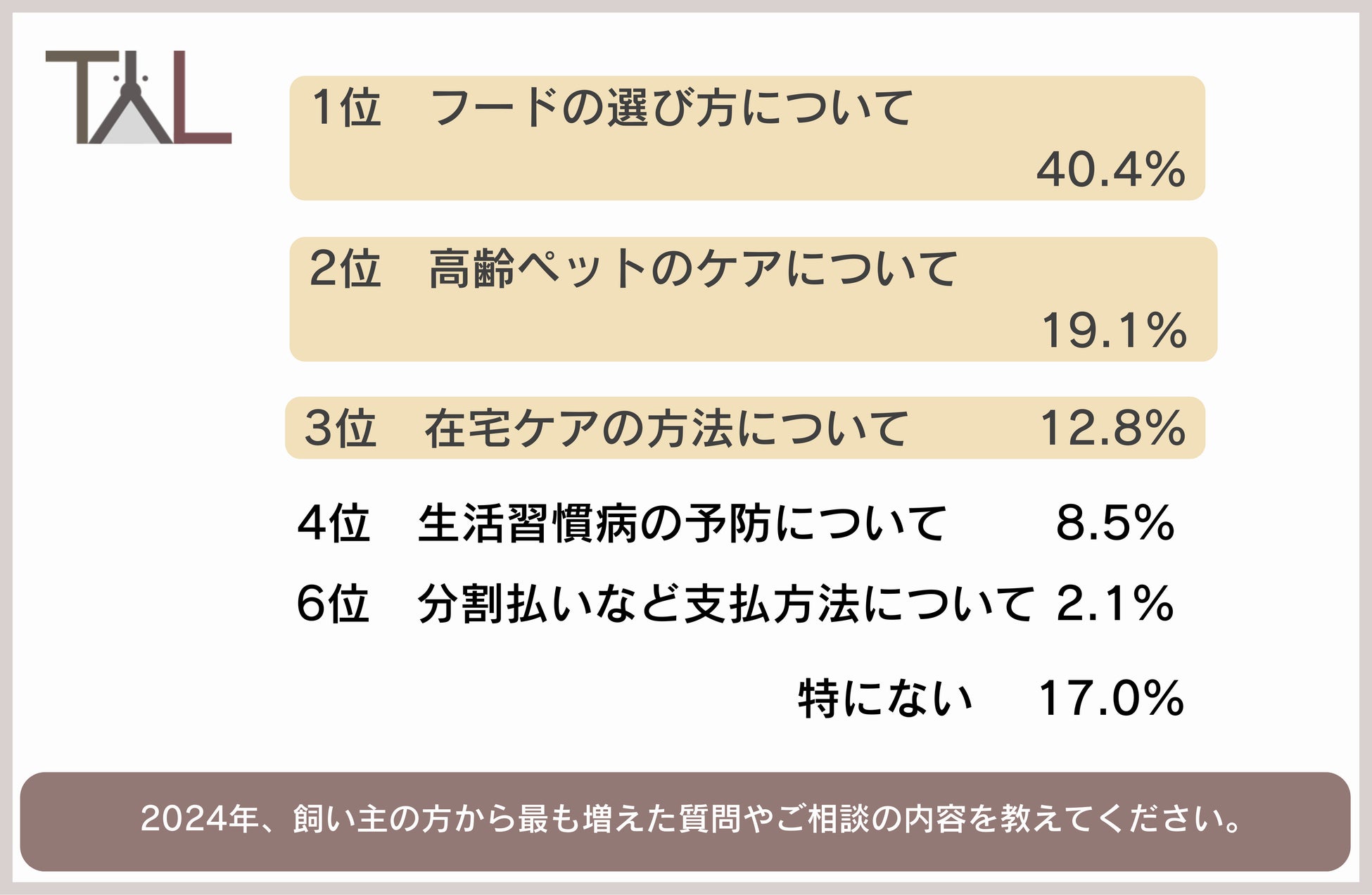 4割の獣医師が、犬猫の飼い主から「フードの選び方について」の相談が増えたと回答。高齢ペットのケア、在宅でのケア方法にも関心が高まっている。