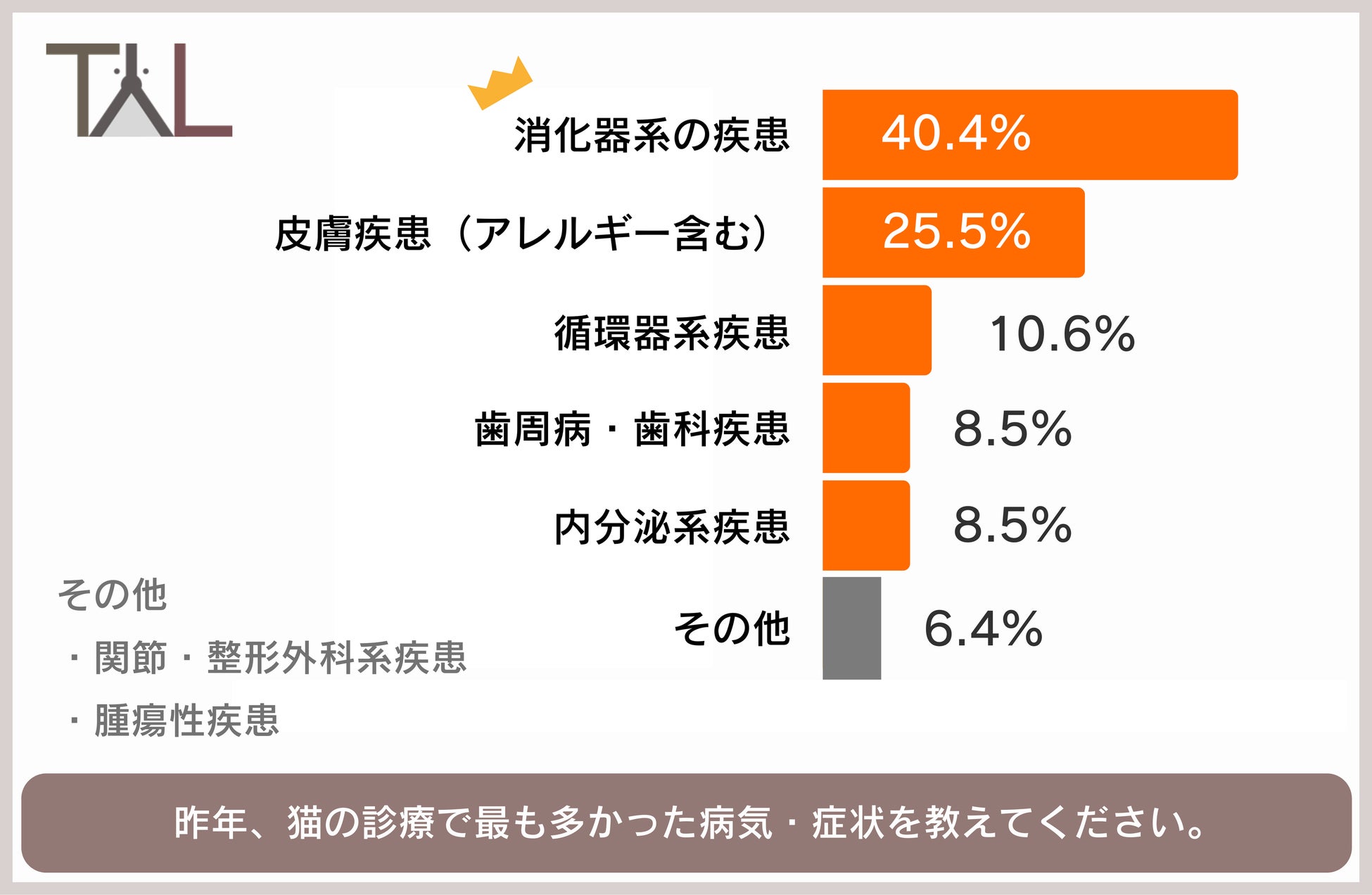 また、獣医師47名に対し「昨年、猫の診療で最も多かった病気・症状を1つお選びください。」と質問したところ、「消化器系の疾患」(40.4%)が最も多く、次いで「皮膚疾患(アレルギー含む)」(25.5%)、「循環器系疾患」(10.6%)という結果となりました。