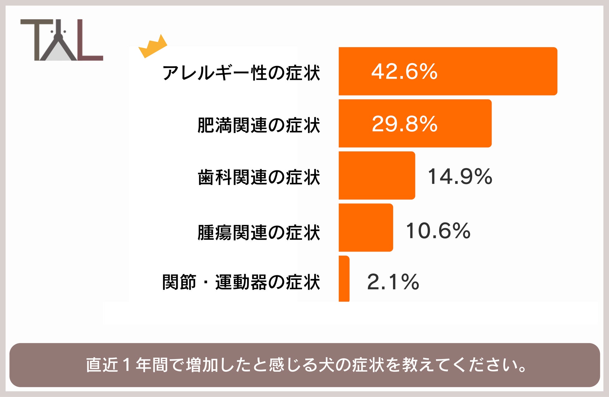 獣医師47名に対し「直近1年間で増加したと感じる犬の症状を1つお選びください。」と質問したところ、1位「アレルギー性の症状」(42.6%)、2位「肥満関連の症状」(29.8%)、3位「歯科関連の症状」(14.9%)という結果となりました。