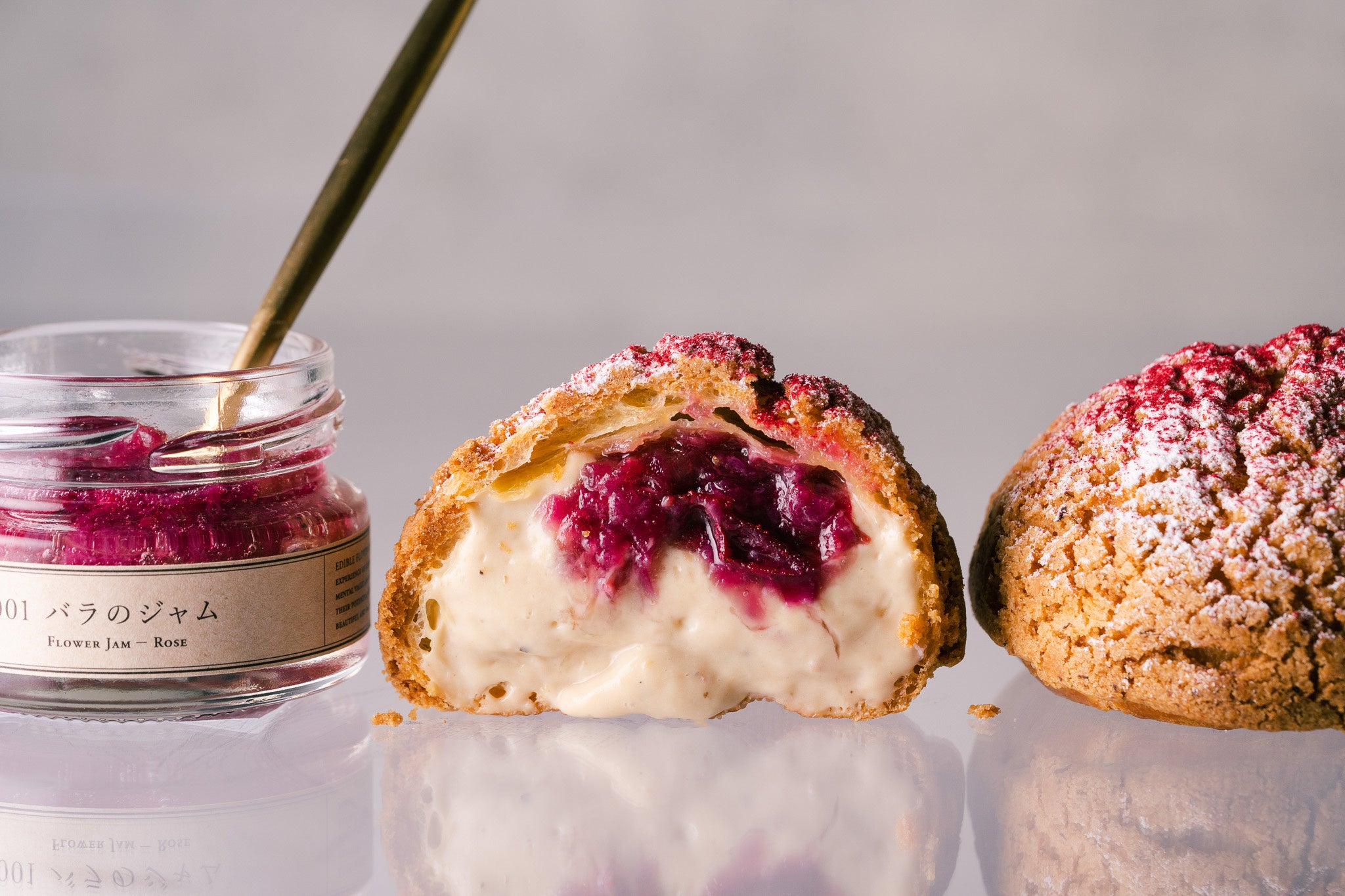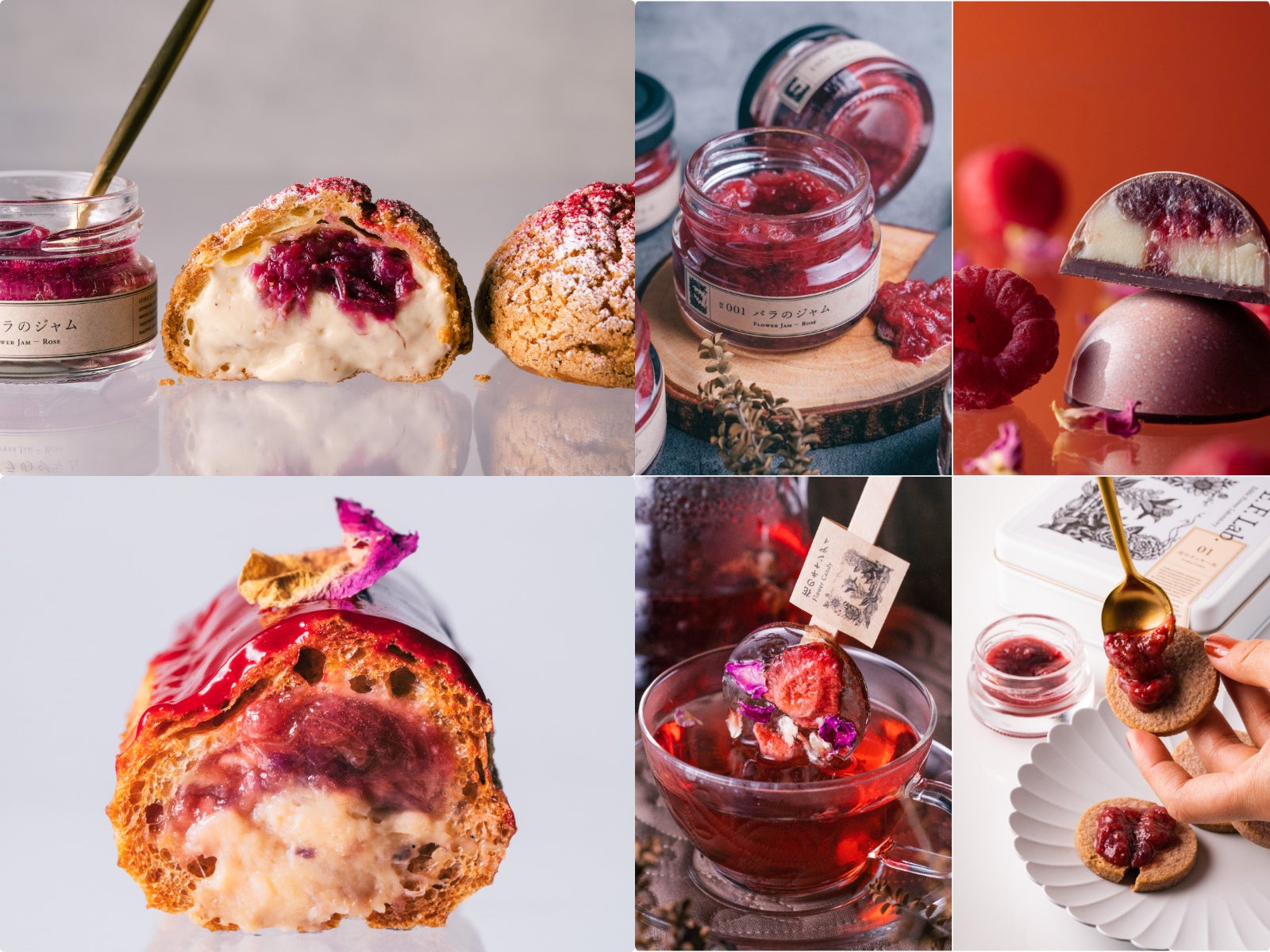 エディブルフラワーの食体験のUP DATEに挑むエディブルフラワー研究所。今回販売するのは「バラのエクレア(972円 税込)」「バラのシュークリーム(972円 税込)」「バラのジャム(税込1,620円)」「花のキャンディ(税込1,512円)」「薔薇のボンボンショコラ(税込3,024円)」「バラジャムのクッキー缶(税込4,104円)」。映えるのはもちろんのこと、しっかりと“おいしい”花のお菓子体験を提案します。