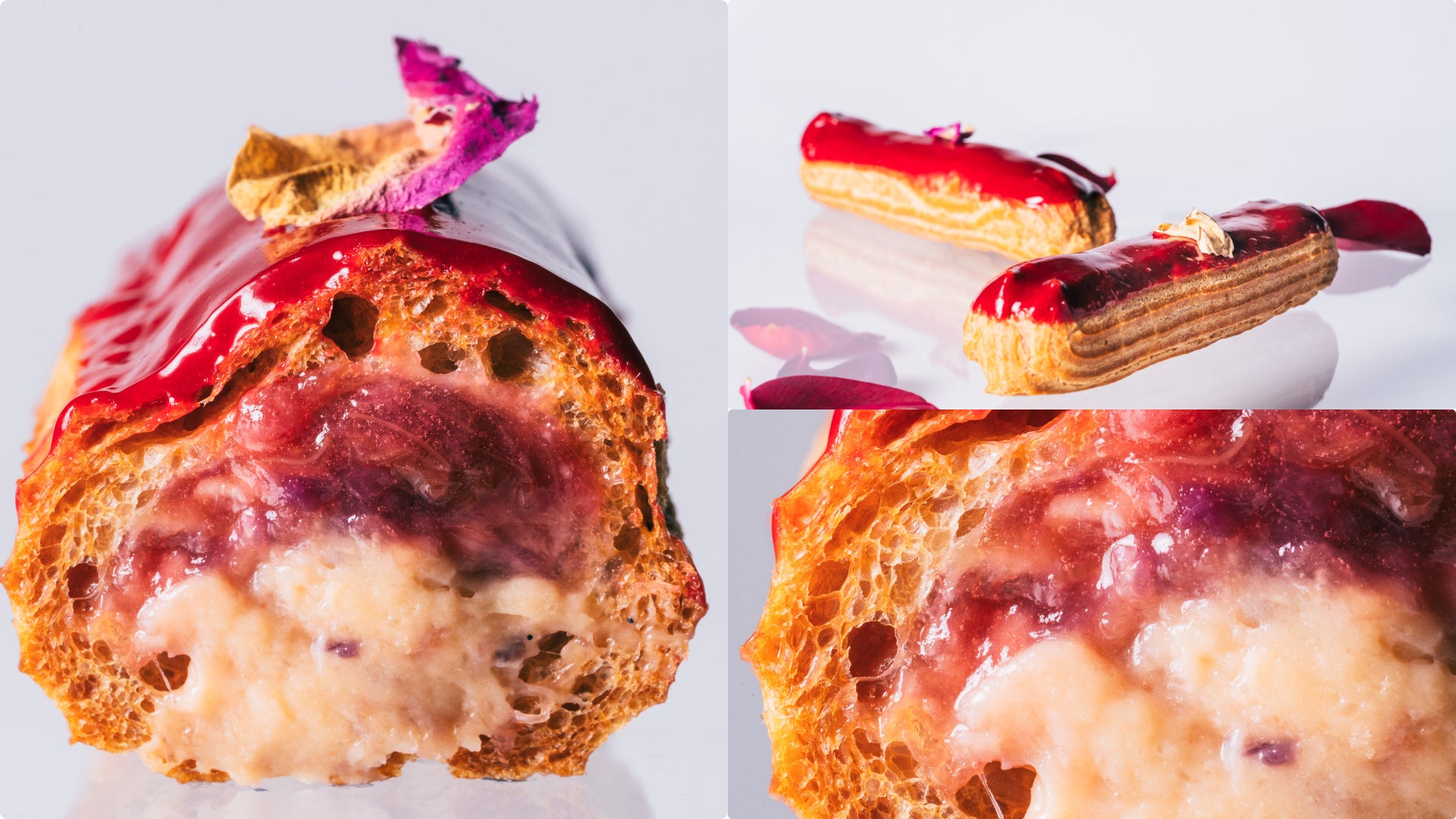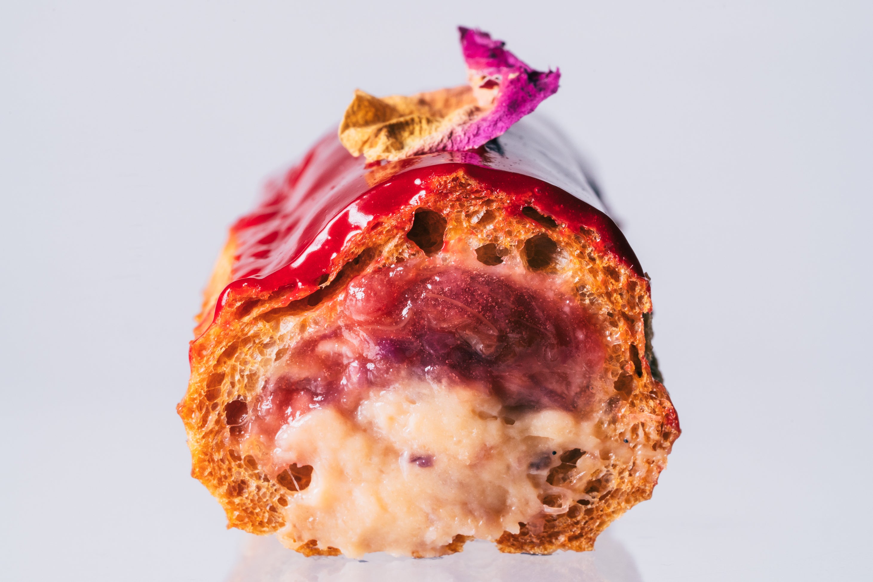 食べられる花屋のスペシャリテの『バラのジャム』と『木苺と赤スグリのピューレ』、『カスタードクリーム』をたっぷりと入れました。木苺が持つ甘酸っぱさ、赤スグリの酸味とわずかな青臭さがバラの香りと相性が抜群。バラの味わいや香りの輪郭をはっきりさせ、味の奥行きと華やかさが広がります。気鋭の若手、カルペディエムの河村シェフとのコラボレーションです。