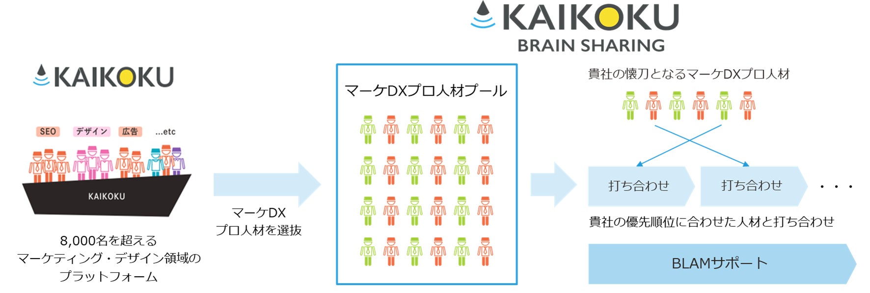 マーケティング・デザインスキルを持つ人材の複業マッチングサービス「KAIKOKU(カイコク)」を運営する株式会社BLAM(ブラム、所在地:東京都品川区、代表取締役社長 兼 CEO:杉生 遊、以下「当社」)は、『カイコク』にご登録されている人材から選抜したマーケDXプロ人材シェアリングを起用し、課題解決のための相談機会とナレッジを得られる新サービス「カイコクブレインシェアリング」の正式提供を開始いたします。