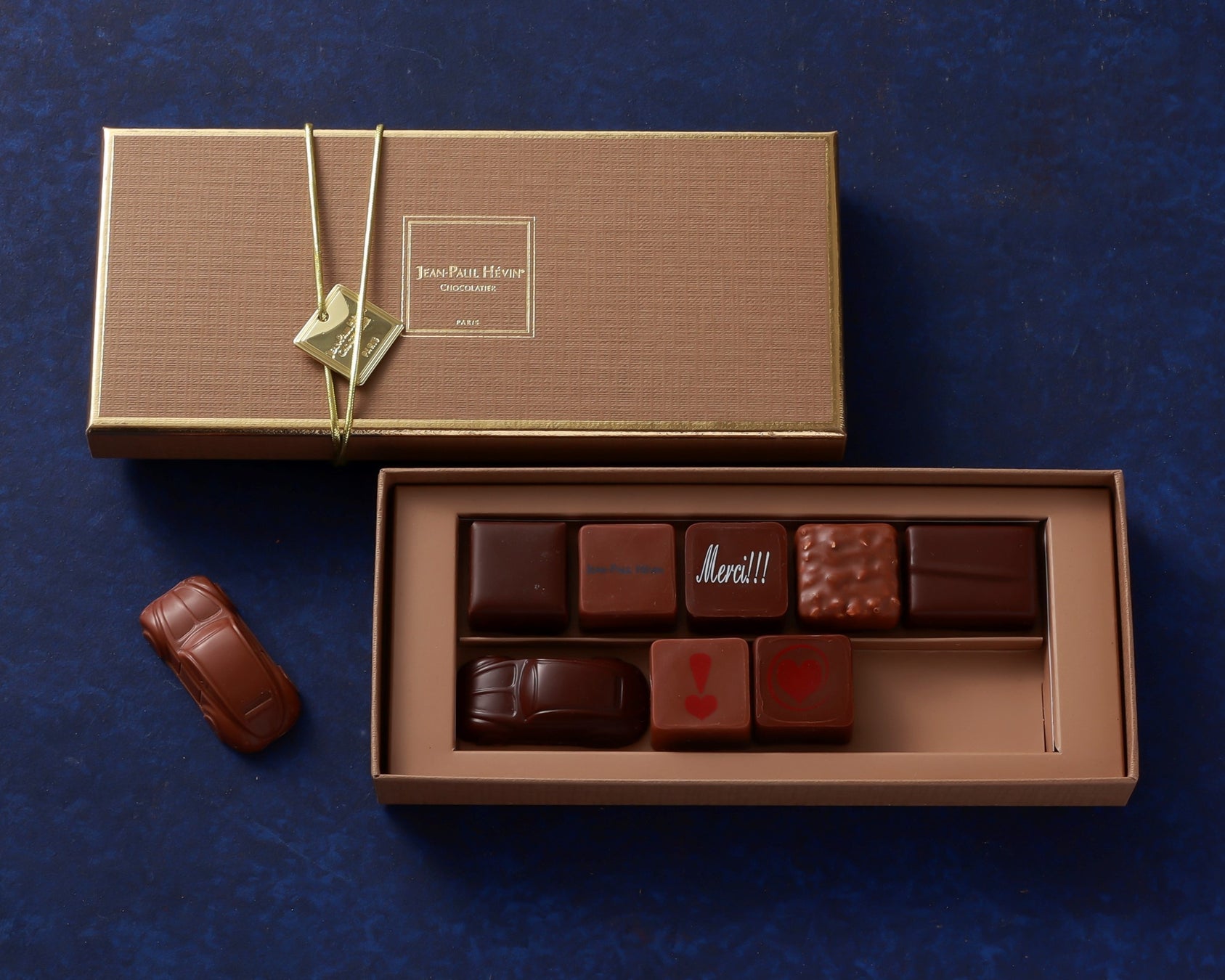 期間限定の車型ショコラ「ヴォワチュール ノワール」「ヴォワチュール レ」と、トンカ豆を加えた風味豊かなガナッシュのボンボンショコラ「メルシー」他が入った詰合せ。5個、11個、17個の詰合せもご用意しております。