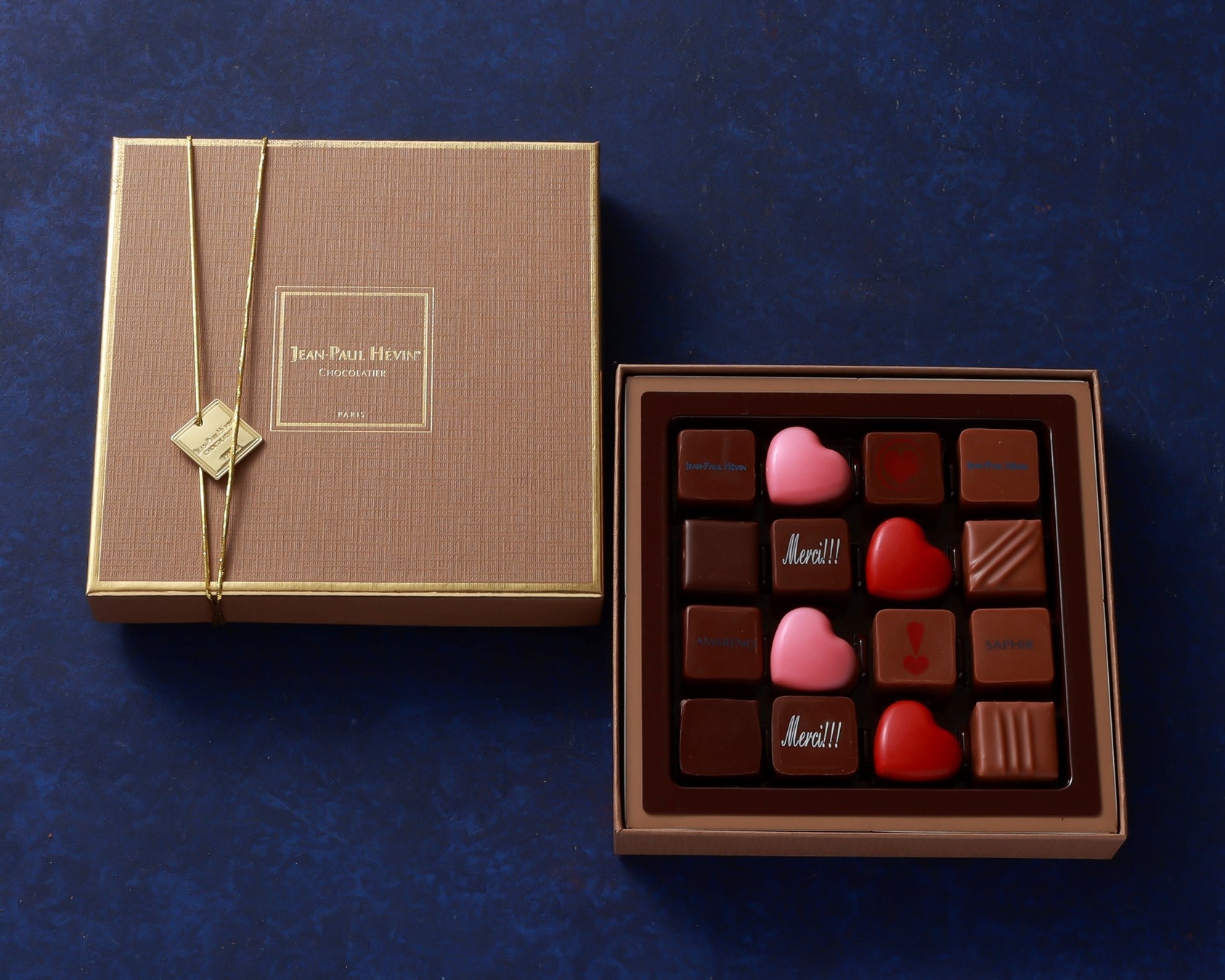 「メルシー(ありがとう)」のメッセージがデザインされたショコラが入った詰合せ。他に4個、8個、9個、25個、50個入りもご用意しております。
