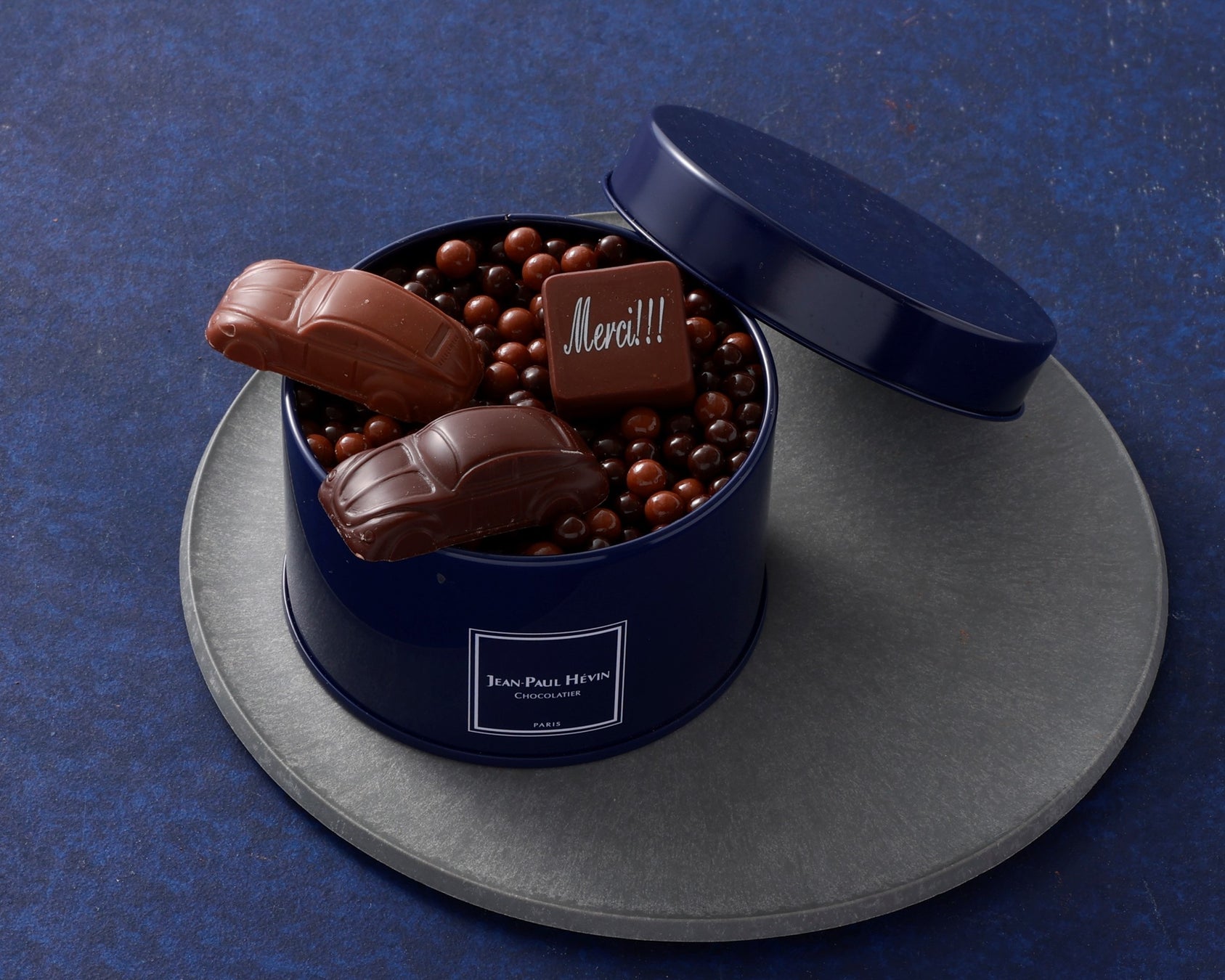 期間限定のショコラ3個(「ヴォワチュール ノワール」「ヴォワチュール レ」「メルシー」)と、シリアルをチョコレートでコーティングした「ペルル クラッカントゥ ショコラ メランジュ」をブルーの缶に詰合せ。