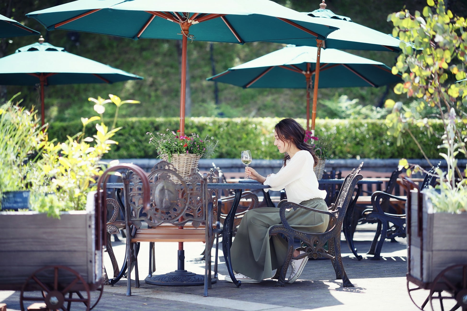 標高400メートルの広場にずらりと並ぶパラソルの下で、お昼からワイングラス片手に優雅に過ごす休日!3/19(土)より「ハーブマルシェ」を開催中!「デザートワイン」や「仔羊のブロシェット」が新登場。