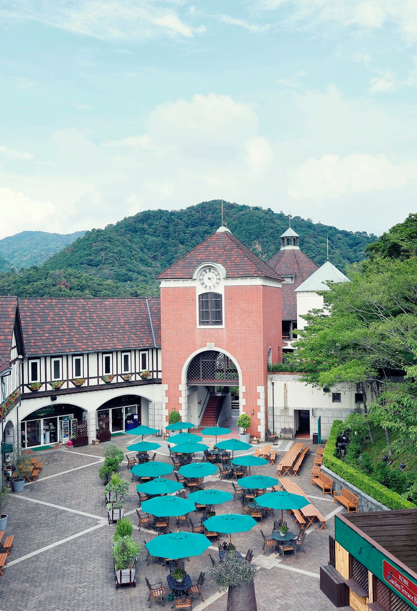 標高400メートルの神戸の街並みを眼下にした広場は、ずらりとパラソルが並ぶ憩いの空間です。