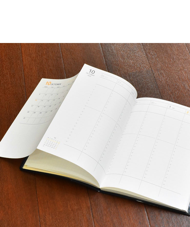 月間カレンダーは折り畳み式。広げると月間の予定と1週間の予定を見開き1ページで管理できます。スケジュール管理が面倒という心理的な敷居を下げました。