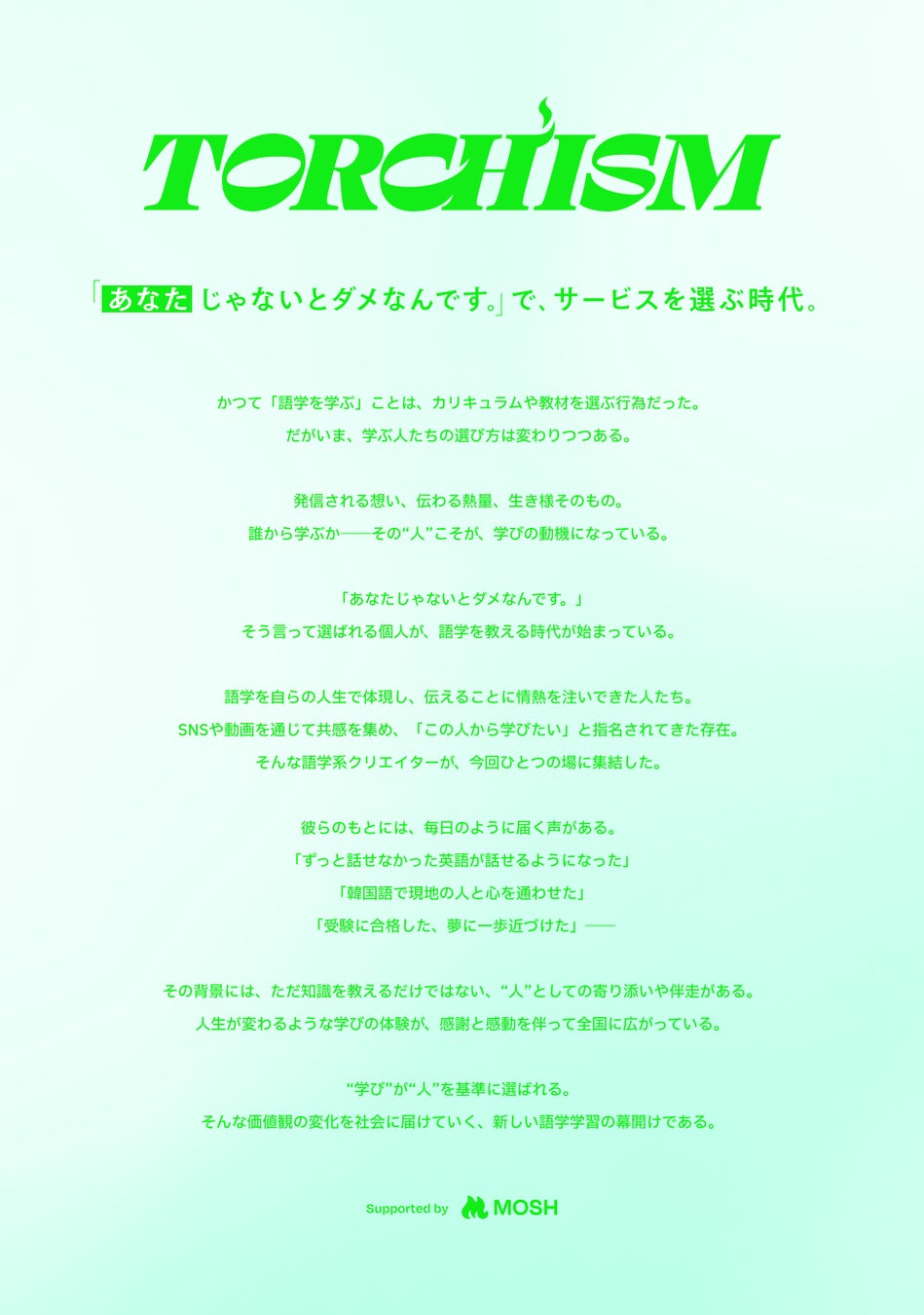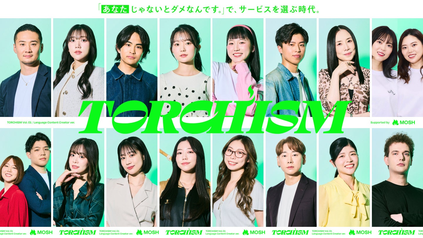 MOSHはこうした潮流を受け、SNS総フォロワー数600万人を超える語学クリエイター16名と共創する新プロジェクト「TORCHISM」を開始いたします。
