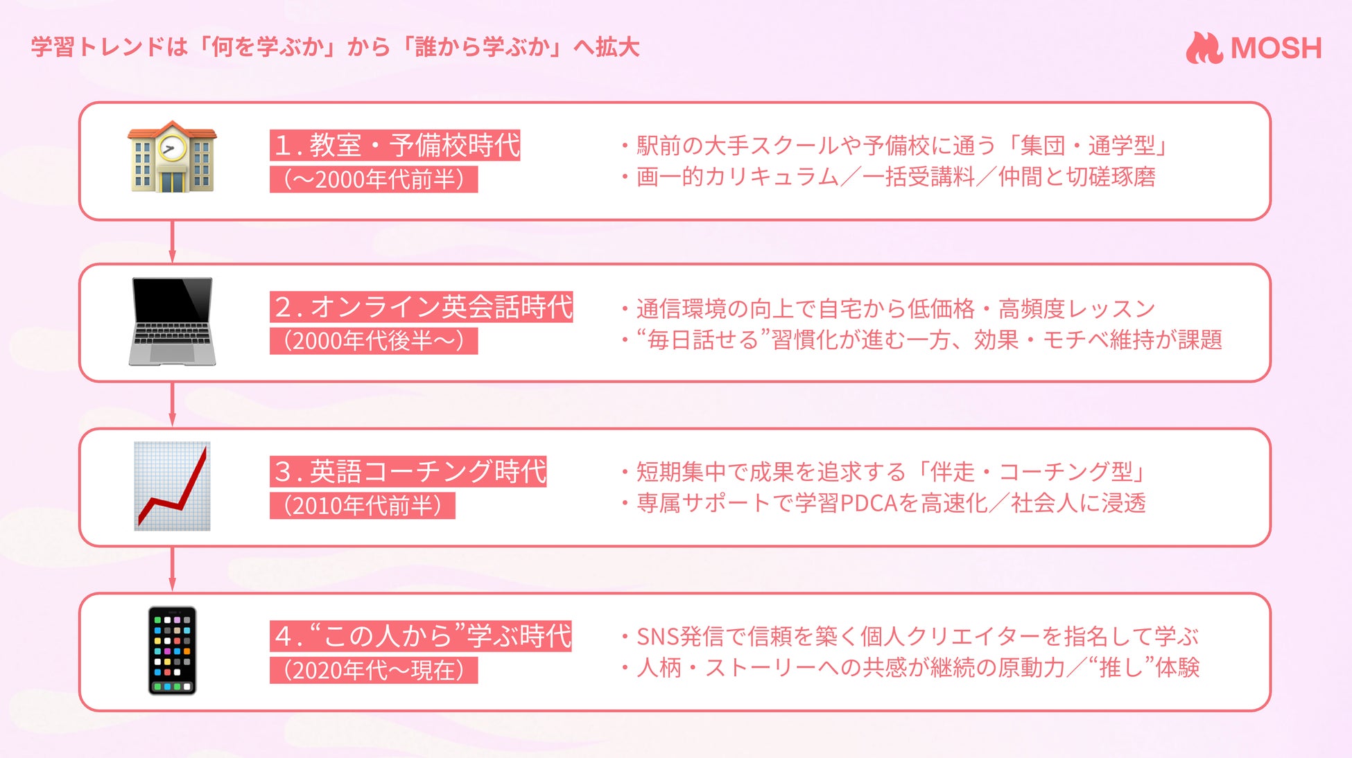 従来の“効率性”や“価格”だけでなく、信頼・共感・モチベーションといった“学びの体験価値”そのものが重視されるようになっています。MOSHは、まさにこうした学びのトレンドに応えるかたちで、語学クリエイターとともに「推しから学ぶ」を実現する新プロジェクト「TORCHISM」を始動しました。