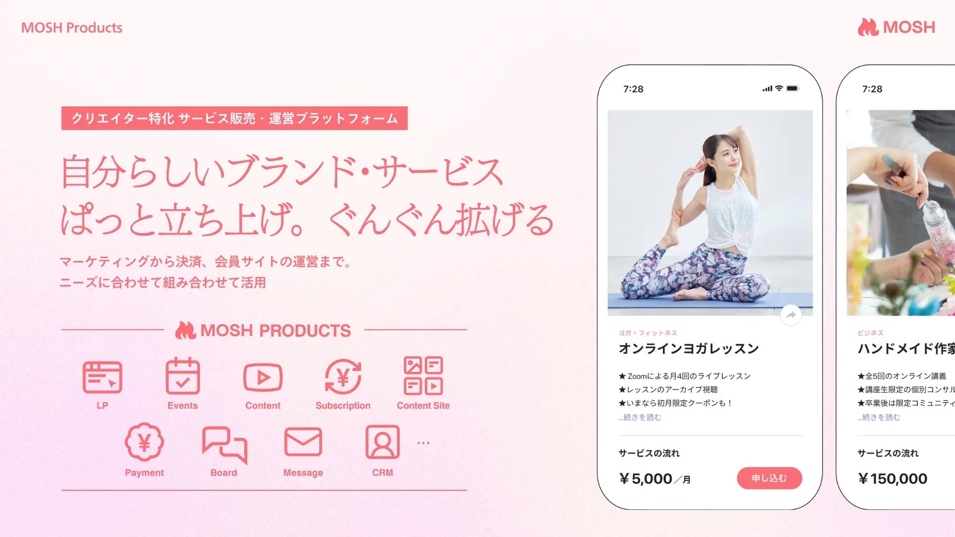 MOSHは、個人ブランドやサービスをインターネットで簡単に販売・運営できるプラットフォームです。マーケティングから決済、コンテンツ管理、顧客管理や会員サイトの運営まで、ニーズに合わせて組み合わせて活用できます。