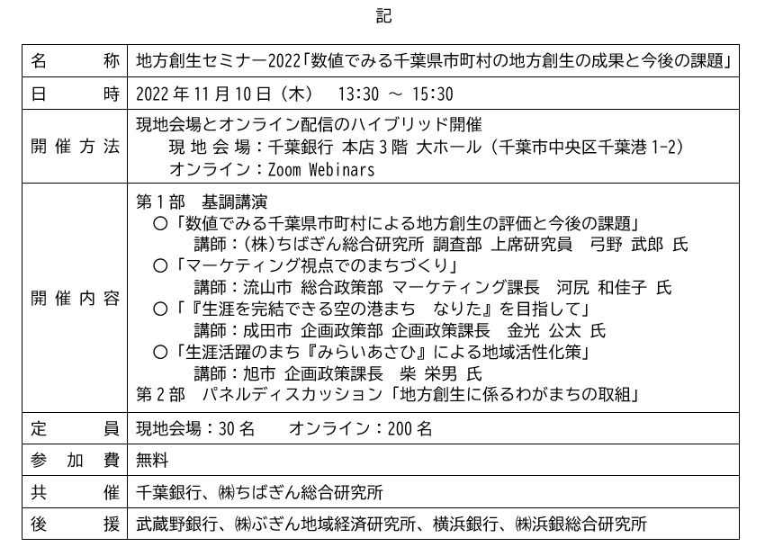 千葉銀行(頭取 米本 努)は、2022年11月10日(木)、グループの株式会社ちばぎん総合研究所(取締役社長 前田 栄治)とともに、自治体及び企業の職員を対象とした「地方創生セミナー2022」を、下記の通り共催します。