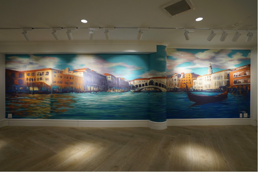 今回、彼がインティミッシミアートスペースのために描いた壁画のタイトルは、「夕凪- yunagi」。ヴェネチアの代表的なリアルト橋や、カナル・グランデに浮かぶゴンドラ、クラシックなイタリアの建物を、まるで、優雅にゴンドラに揺られながら、ゆったりと眺めているような気分にさせてくれます。