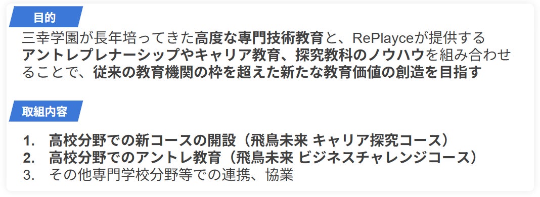 学校法人三幸学園(本部:東京都文京区 理事長:鳥居 敏、以下 三幸学園)と株式会社RePlayce(本社:東京都渋谷区 代表取締役CEO:山本 将裕、以下 RePlayce)は、次世代人材育成に向けたアントレプレナーシップ及びキャリア教育、探究的な学び(以下、アントレ・キャリア探究)の拡充に関する業務提携を締結したことをお知らせいたします。