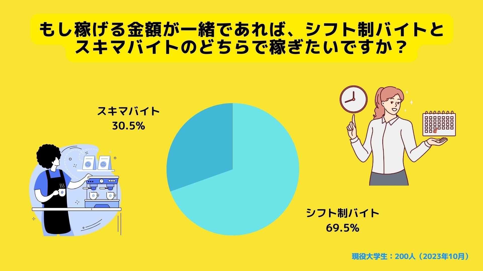 稼げる金額が一緒である場合は、シフト制バイトを望む学生が69.5%という結果になりました。しかし実際はスキマバイトだけでなく、大学生はシフト制バイトと併用してスキマバイトを利用しているようです。