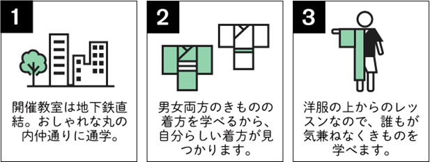 おしゃれな丸の内仲通り、駅直結の教室で、性別関係なく女性きものと男性きもの、どちらの着方も学べます!