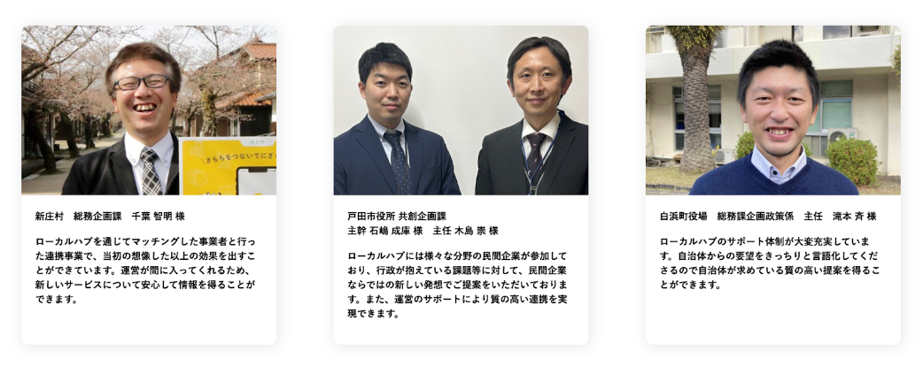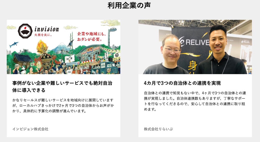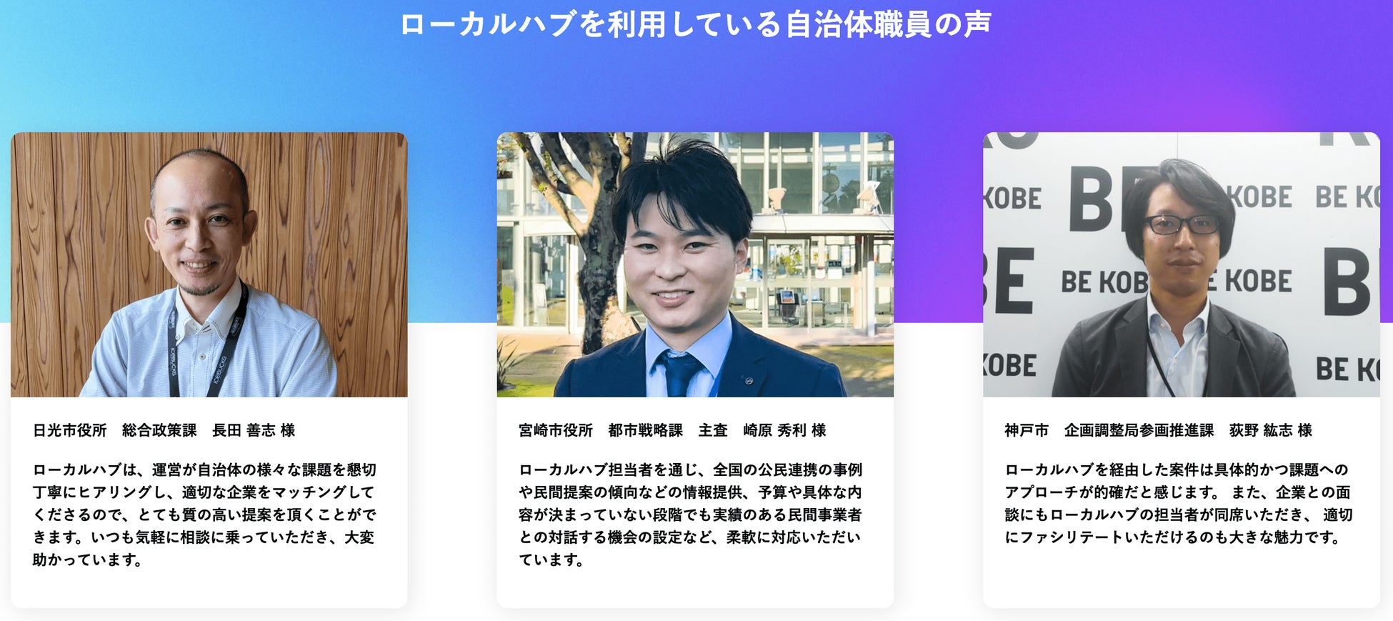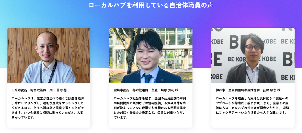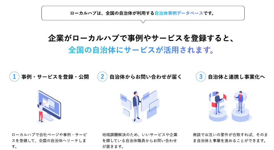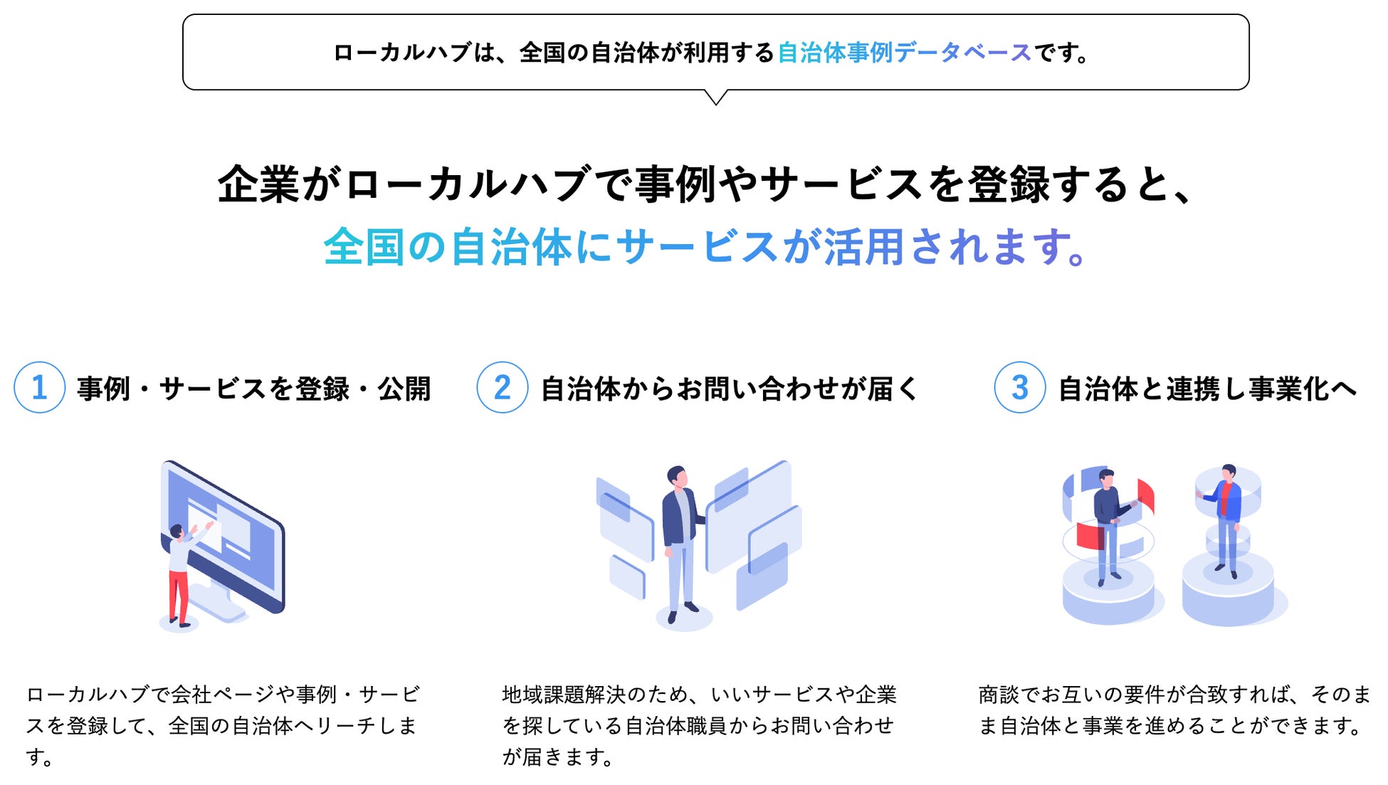 企業はローカルハブに自社サービスの情報を掲載するだけで自治体からお問い合わせを待つことができます。(下記、ローカルハブを活用している民間企業様の声)