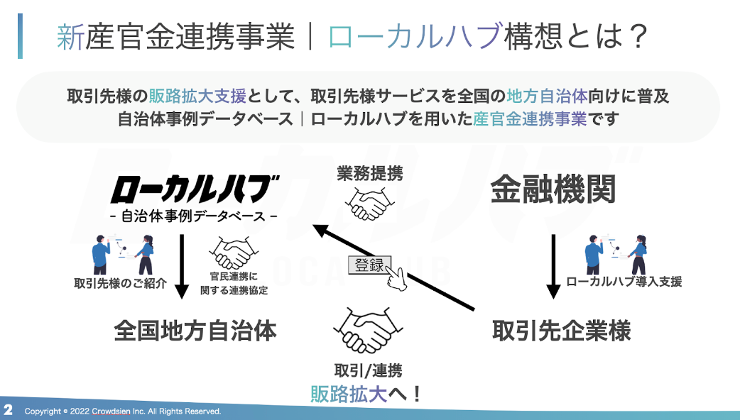 自治体事例データベース|ローカルハブ(事業開発者:佐々木大地)を提供する株式会社クラウドシエン(本社:広島県広島市、代表取締役:神原 翔吾)は、ご融資先の販路拡大支援をしながら、各支店の安定収益を目指せる金融機関向け協業プラン「新産官金連携事業|ローカルハブ構想」の協業パートナー募集を開始しました。
