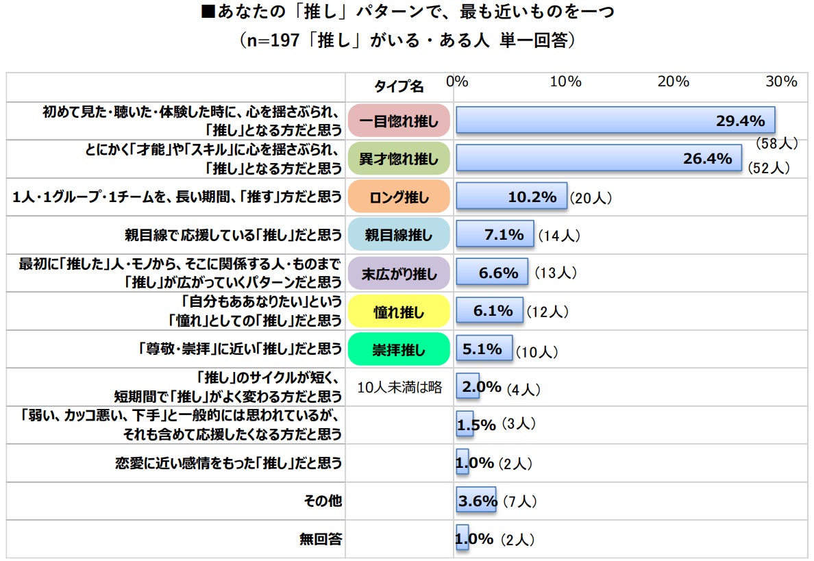 ⇒現在「推し」がいる 197 人に、自分の推しタイプをたずねたところ、「一目惚れ推し」タイプが 29.4%(58 人)、「異才惚れ推し」が 26.4%(52 人)で、この両者で 55.8%を占めている。