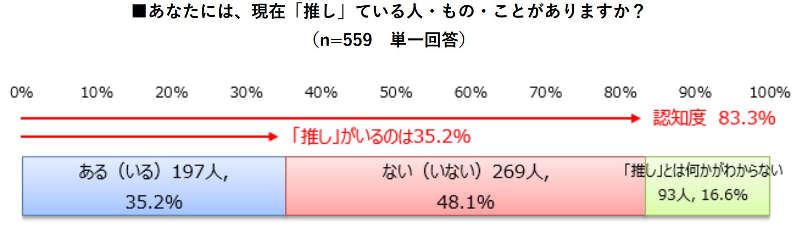 ・現在、「推し」がいる人は全体(559 人)の 35.2%(197 人)、いない人は 48.1%(269 人)、合わせて83.3%(466 人)が、「推し」を認知している。
