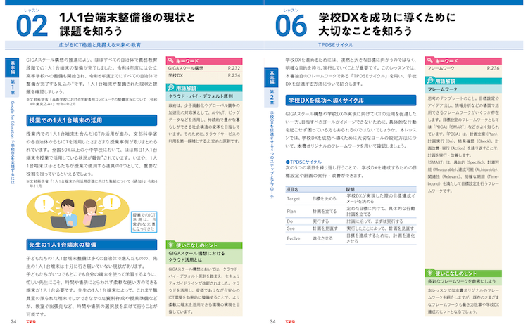 Google for Education と学校DXの概要を学べる「基本編」、便利な操作手順をバリエーション豊かに揃えた「活用編」の2部で構成されており、基礎から応用まで無理なく身に付けていただけます。