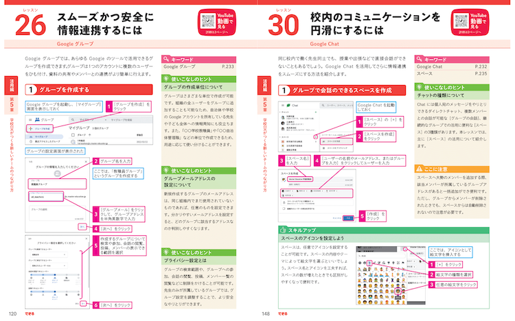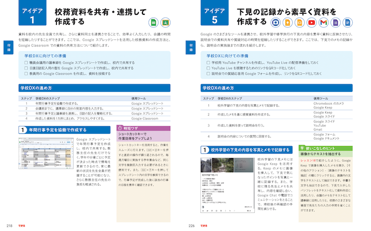 巻末には、Google のアプリケーションを組み合わせた7つの活用アイデアを特別掲載!元教員で、現在はICT支援員として活躍するストリートスマートのメンバーが、学校現場でよくある具体的な場面を例に、学校DXを促進させる4つのステップに則して紹介しています!