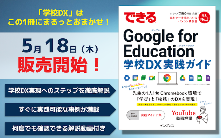 累計7,500万部超えの大人気書籍「できる」シリーズから発行された、『できる Google for Education 学校DX実践ガイド』。本書をご覧になれば、先生と子どもたちの1人1台端末環境における学校DXを促進するための具体的なステップとアプローチの方法が明確になり、さらに Google for Education を最大限に活用した学校DXの豊富なアイデアで、個人でもチームでも明日から学校DXに着手するヒントを得ていただけます。