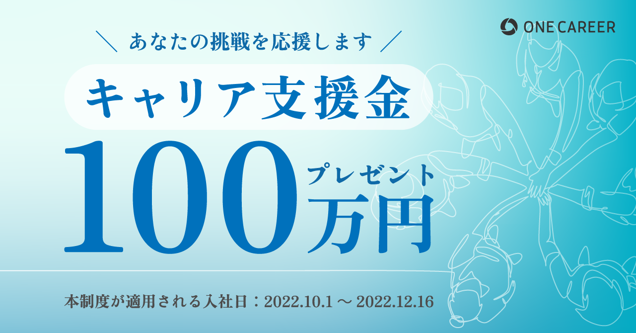 そこで今回、「自分らしいキャリアをワンキャリアで実現したい」、「成長可能性の高い分野に飛び込みたい」という方に向けて「キャリア支援金制度」を新設いたしました。本制度は、当社に直接ご応募の上ご入社された方に、100万円をお支払いするものです。