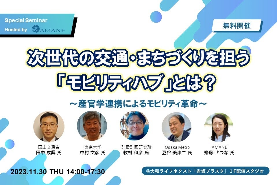 国交省・東京大学・計量計画研究所・Osaka Metro・AMANEが登壇「次世代の交通・まちづくりを担う「モビリティハブ」とは? ~産官学連携によるモビリティ革命~」11月30日(木)開催