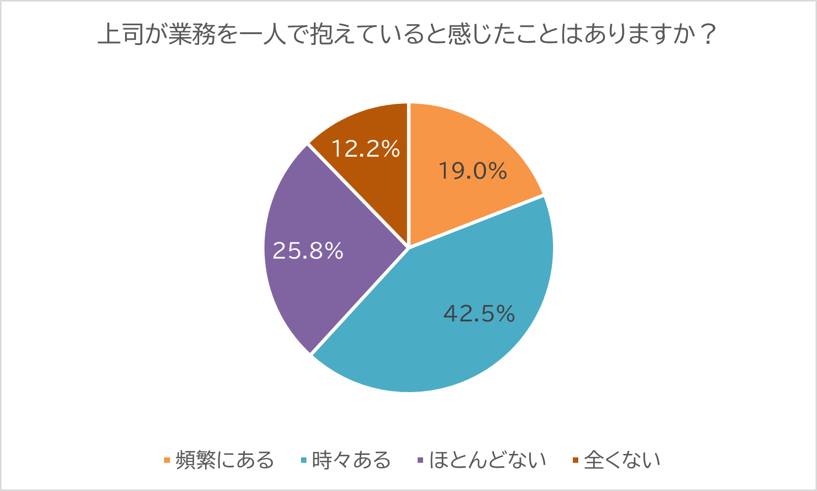 さらに、「上司が一人で業務を抱え込んでいると感じるか」を問うと、19%が「頻繁に感じる」、約43%が「時々感じる」と回答し、全体で約62%が上司が業務分担をしきれていない、オーバーしている実態を感じていることが明らかになりました。