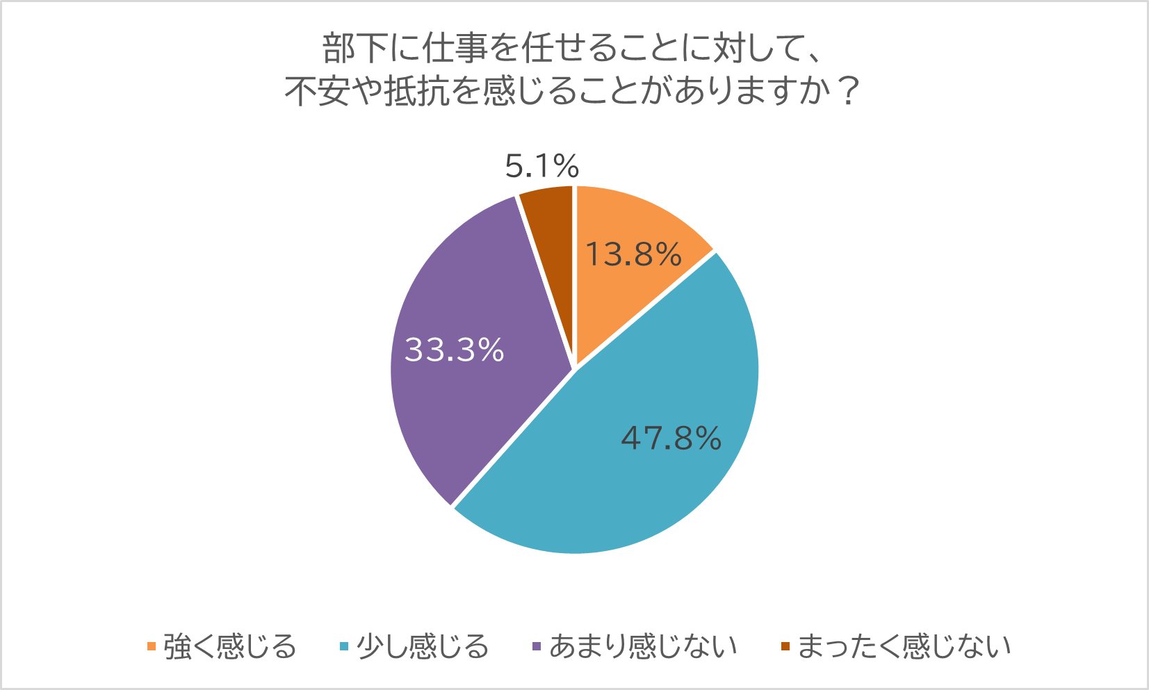 「部下に仕事を任せることに対して、不安や抵抗を感じることがありますか?」と聞くと、「強く感じる」が約14%、「少し感じる」が約48%となり、合計63%が不安や抵抗感を持っていることが明らかになりました。「全く感じない」は5%にとどまっていることからも、部下へどのように仕事を任せれば良いのかへの迷い、任せてサポートするというマネジメントスキルの不足感が感じられる結果となりました。