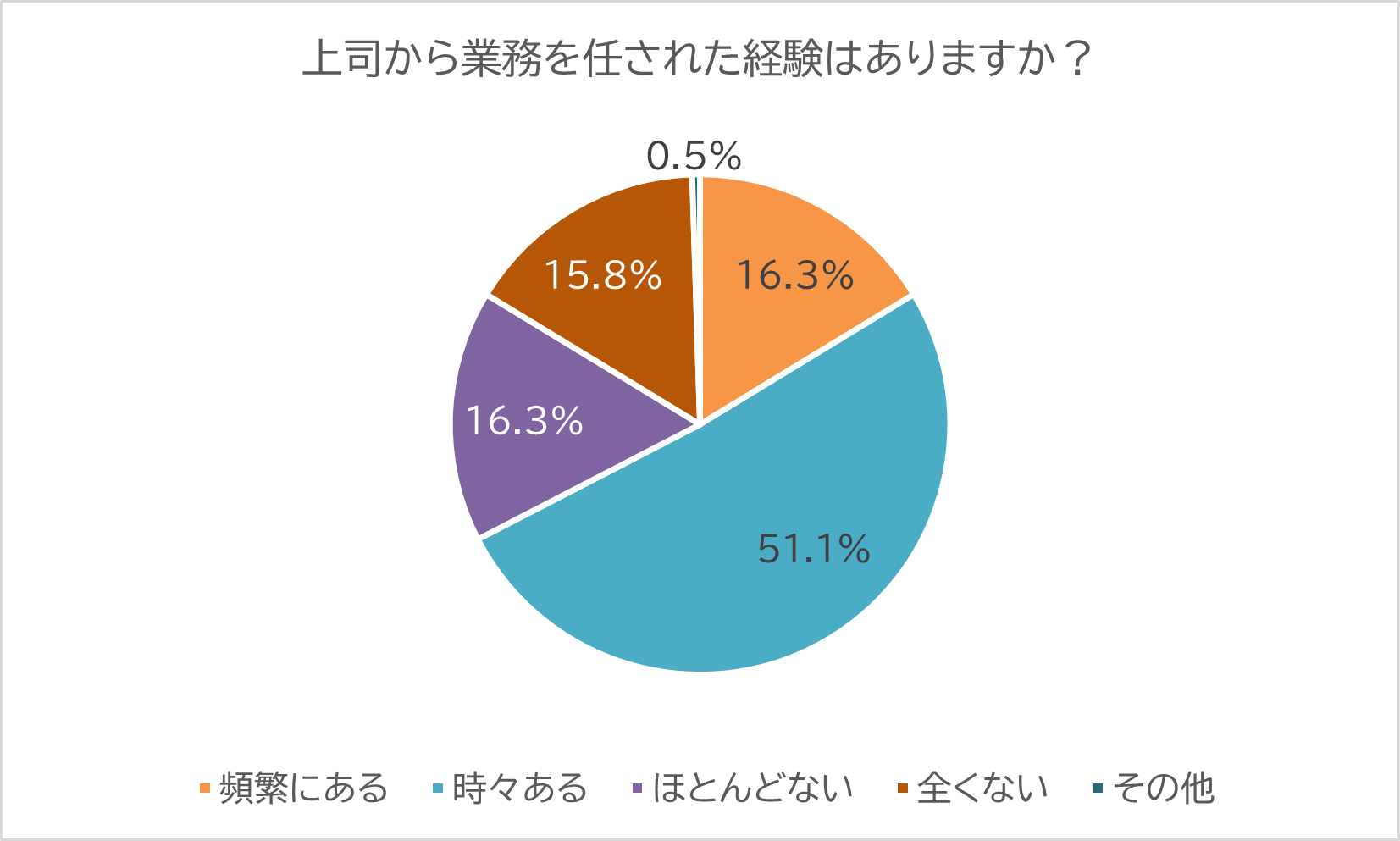 このように忙しい上司から業務を任されているかを問うと、「頻繁に任される」が約16%、「時々任される」が51%となりました。多数の部下が上司の業務過多を感じている一方で、3割以上がほぼ上司からの業務依頼を受けていないという実態も明らかになりました。