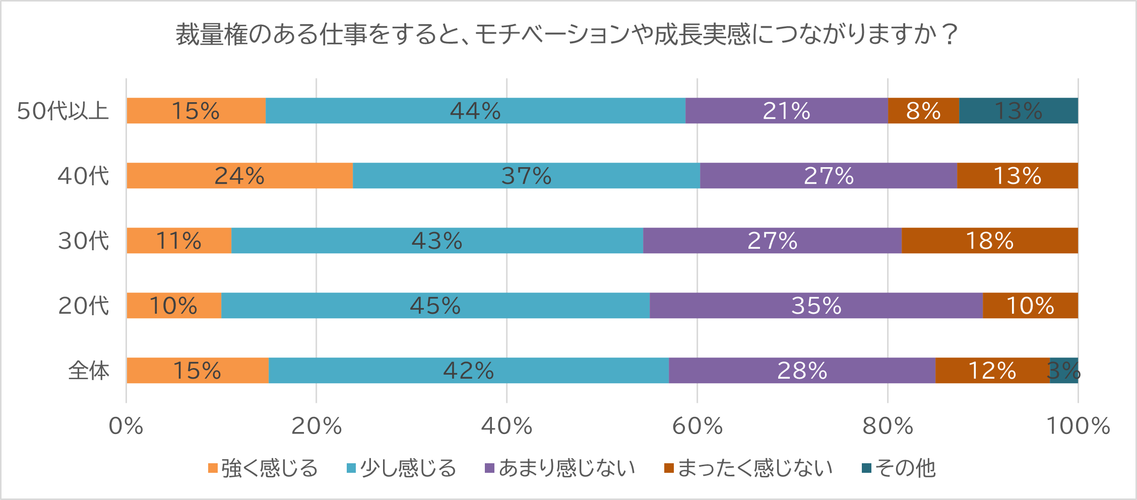 「裁量権のある仕事をすると、モチベーションや成長実感につながりますか?」の設問に対しては、「強く感じる」が15%、「少し感じる」が42%となり、約6割がモチベーションや成長機会に繋がる実感を得られていることがわかります。年代別に見ると、40代がもっともポジティブ回答率が高い結果となりました。社会人経験年数も見ながら業務や仕事の任せ方を采配していくことの効果もありそうです。経験は浅くとも、いかに2,30代のうちから部下に裁量を渡していくか、経験をさせていくかがマネジメントに問われているとも言えます。