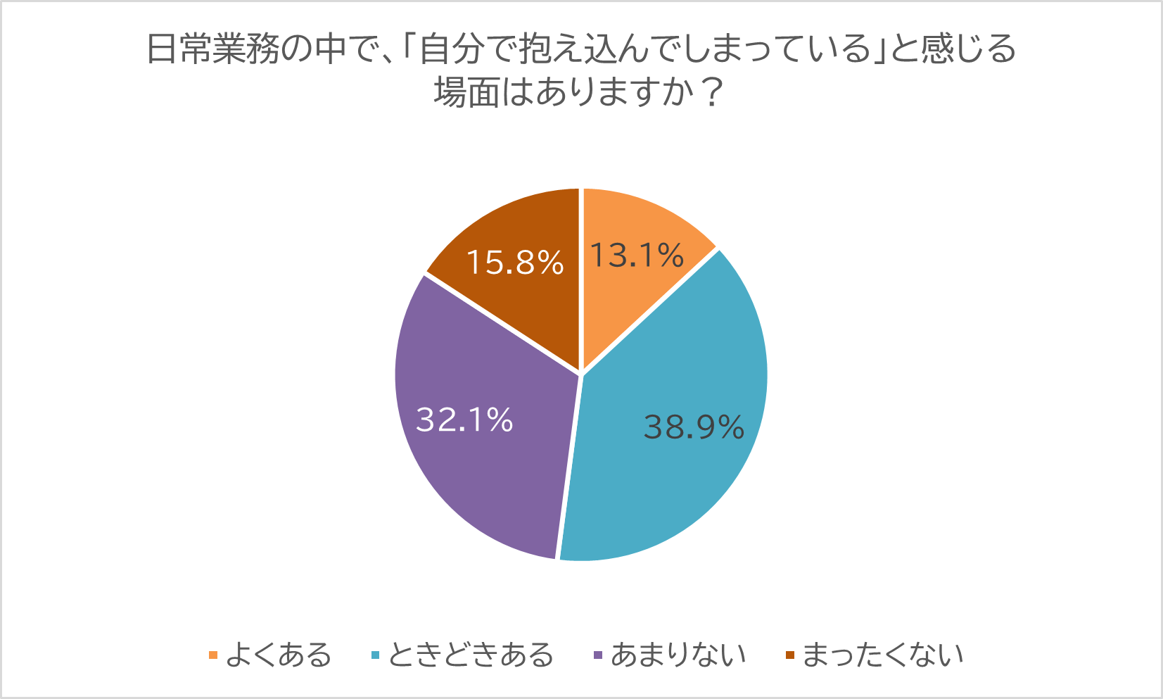 「日常業務の中で、自分で業務を抱え込んでしまっていると感じる場面はありますか?」という設問に対しては、「よくある」が約13%、「ときどきある」が約39%となり、半数以上が日常業務を抱え込みがちな自己認識があることがわかりました。