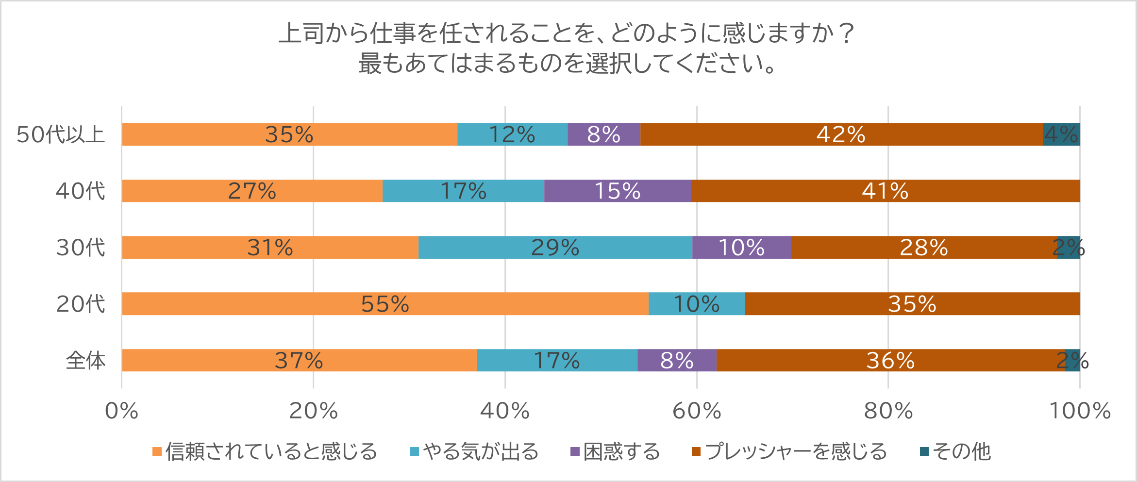 「上司から仕事を任されることを、どのように感じますか?」と問うたところ、「信頼されていると感じる」が37%、「やる気が出る」が17%、「困惑する」が8%、「プレッシャーを感じる」が36%という結果となりました。信頼を感じたりやる気が出るなどのポジティブ回答は約半数となり、年代別に見てみると特に20代で多いことがわかります。