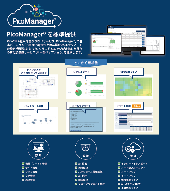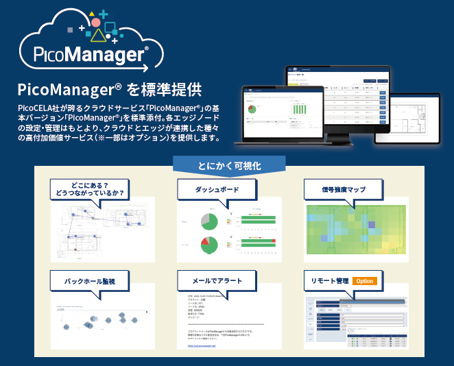独自の無線多段中継テクノロジーに加え、クラウド管理システム「PicoManager ®」の標準提供によりリモート管理を実現に
