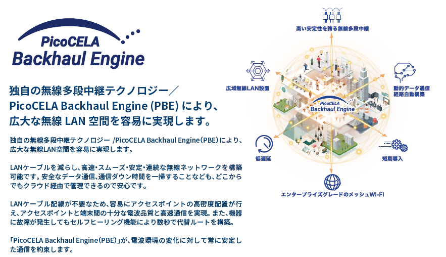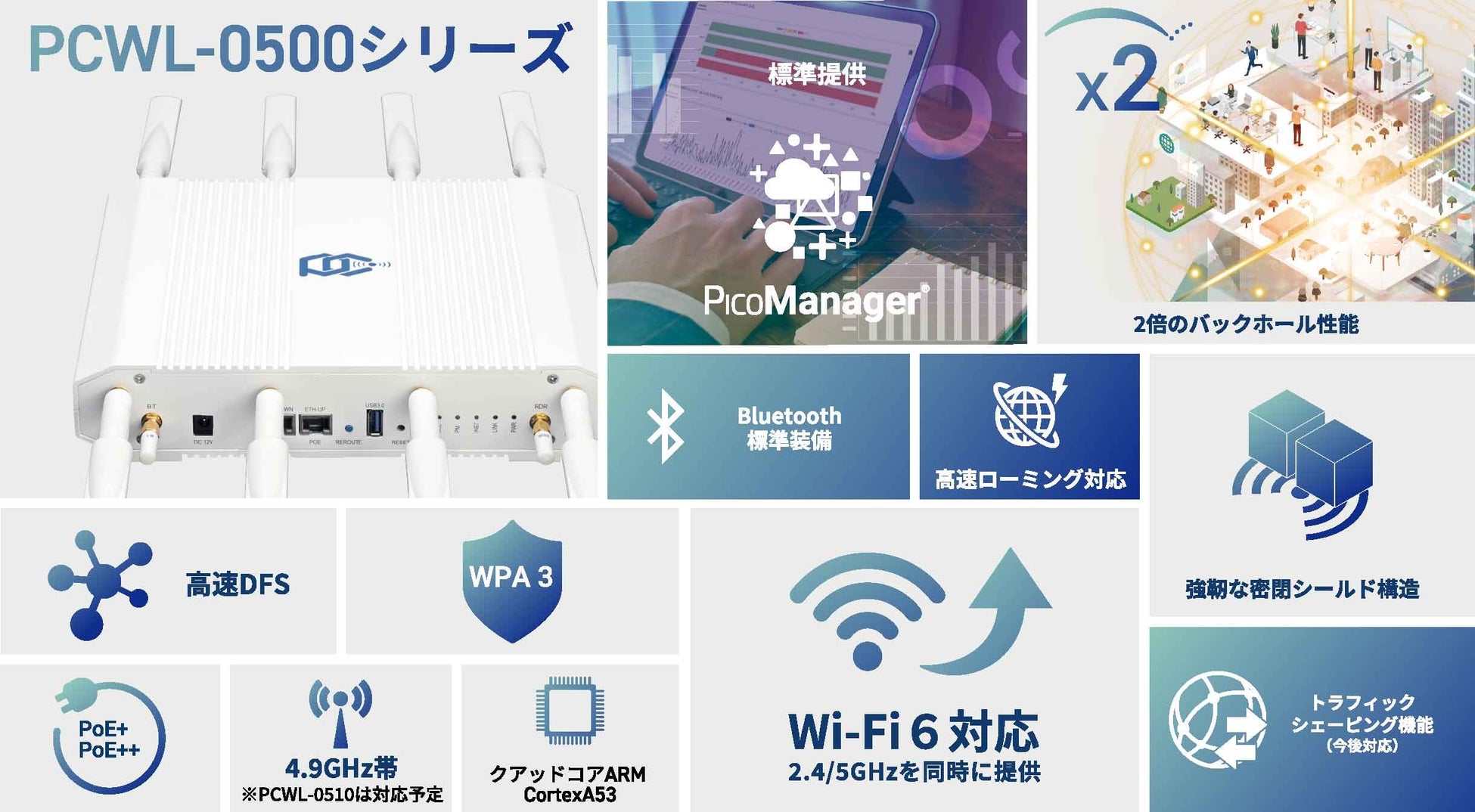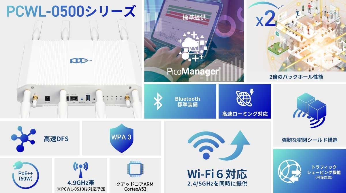LANケーブルの配線を大幅に削減することができる革新的エンタープライズ無線メッシュテクノロジーを搭載した無線アクセスポイントを販売しているPicoCELA株式会社(東京都中央区、代表取締役社⻑ 古川 浩 以下、PicoCELA)は、最新の無線LAN規格であるIEEE802.11axに対応し、クラウド管理システム「PicoManager ®」を標準提供した、「PCWL-0500」シリーズを発表しました。本日、2023年1月17日(火)リリース致します。