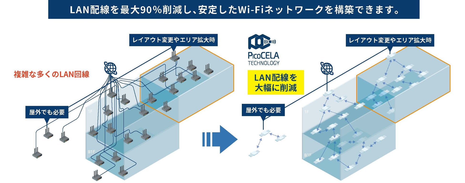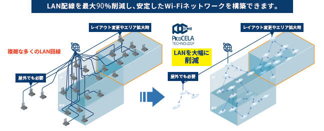 PicoCELAを導入することで、LAN配線を最大90%削減し、安定したWi-Fiネットワークを構築できます。
