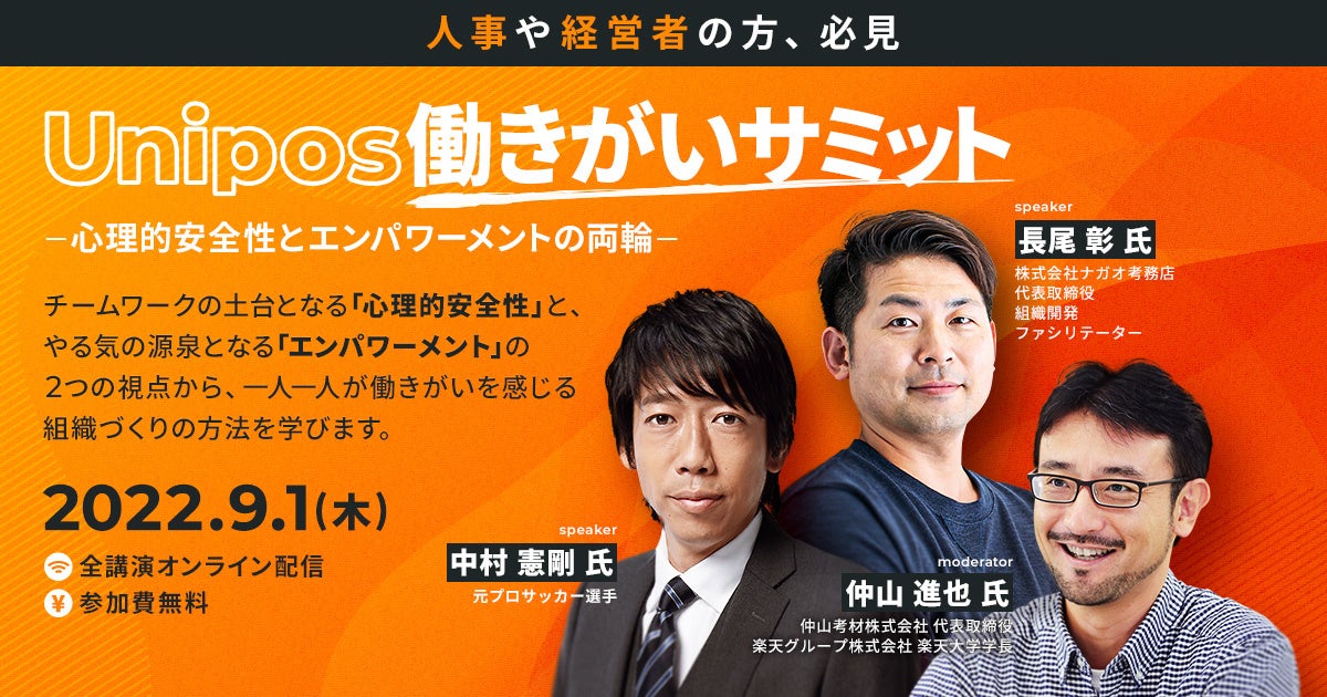 心理的安全性を高め、挑戦できる風土をつくるHRテック事業「ピアボーナス®︎Unipos」(以下、Unipos)を提供するUnipos株式会社(本社:東京都渋谷区、代表取締役社長CEO:田中弦)は、2022年9月1日(木)に「Unipos働きがいサミット~心理的安全性とエンパワーメントの両輪~」をオンラインで開催します。元サッカー日本代表 中村憲剛氏をゲストに、中村氏が帯コメントを書いた書籍『アオアシに学ぶ「考える葦」の育ち方: カオスな環境に強い「頭のよさ」とは』の著者・楽天大学 学長 仲山進也氏がモデレーターを務めるセッションなど全4講演を用意。一人ひとりが働きがいを感じる組織づくりの方法を学べるイベントです。