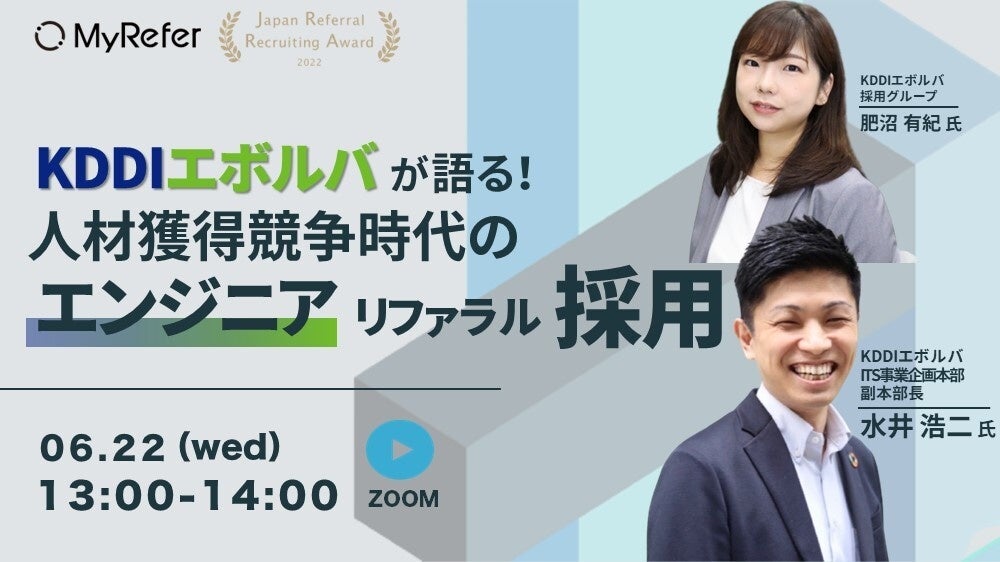 株式会社MyRefer(本社:東京都新宿区、代表取締役社長CEO:鈴木貴史)は、エンジニアの獲得競争激化を背景にリファラル採用に取り組み「Japan Referral Recruiting Award 2022」でBest Matching賞を受賞した株式会社KDDIエボルバ様をお招きして、「人材獲得競争時代を勝ち抜くエンジニアリファラル採用」をテーマにお話いただくオンラインイベントを6月22日(水)に開催いたします。
