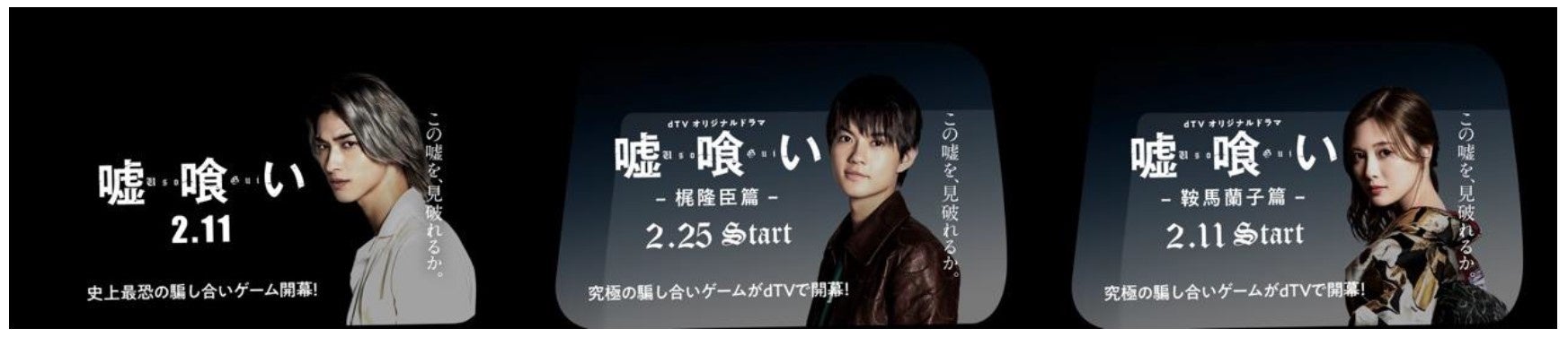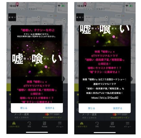 この度、迫稔雄作のシリーズ累計880万部突破の人気漫画「嘘喰い」(うそぐい)を実写化した映画『嘘喰い』の公開(2022年2月11日(金)より全国で公開)と、映像配信サービス・dTV®にて、映画にも登場する人気キャラクターに焦点を当てたオリジナルドラマ「噓喰い -鞍馬蘭子篇/梶隆臣篇-」の独占配信(2022年2月11日(金)より配信 全4話)を記念し、本日2月7日(月)〜2月20日(日)まで、「Canvas」を活用した『嘘喰いタクシー』50台(大和自動車交通株式会社・国際自動車株式会社)が都内を走行することをお知らせします。走行期間中は、タクシーアプリ「S.RIDE」にて『嘘喰いタクシー』の指定配車が可能です。配車までの手順に関しては、以下よりご確認ください。