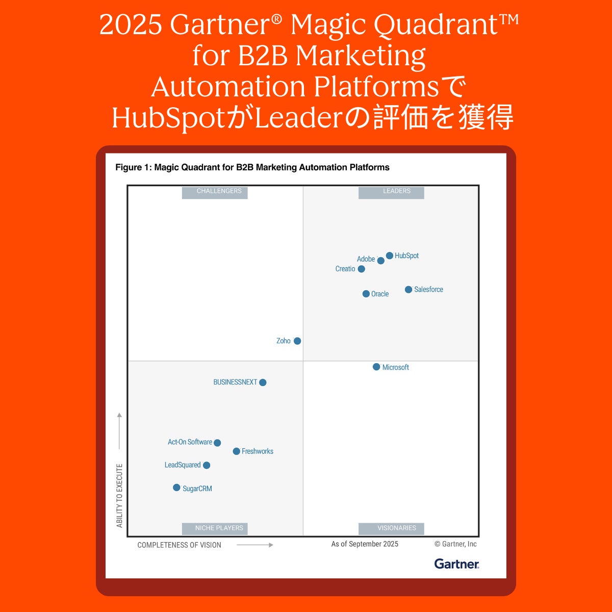 CRM搭載のカスタマープラットフォームを提供するHubSpot Japan株式会社(所在地:東京都千代田区、日本法人代表:キャサリン ビューカー、以下 「HubSpot」)はこのたび、当社が提供するマーケティング支援ソフトウェア「Marketing Hub」がGartner社の調査レポート「2025 Gartner® Magic Quadrant™ for B2B Marketing Automation Platforms」(※1)において、「Leader」の評価を獲得したことをお知らせいたします。Magic Quadrantでは「ビジョンの完全性」と「実行能力」という2つの基準で評価が行われ、HubSpotのMarketing Hubは同カテゴリーにおいて5年連続でLeaderに選出されました。