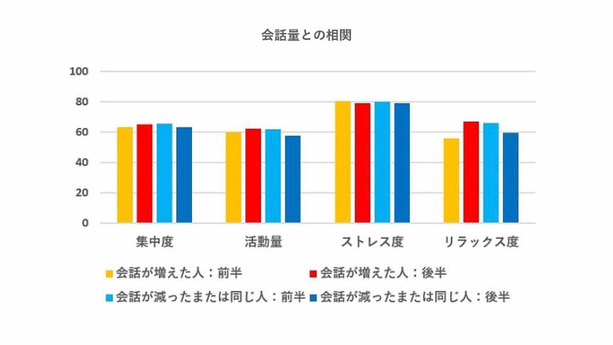 ※ポジティブな差のあった社員の生体データを分析すると、「集中度、活動量、リラックス度」が特に良化していました。