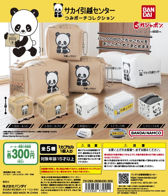 株式会社バンダイ ベンダー事業部(本社:東京都台東区)は、株式会社サカイ引越センター(本社:大阪府堺市)が製造する梱包資材やトラックの荷台などを再現したポーチ『サカイ引越センター つみポーチコレクション』(1 回300 円・税 10%込、全 5 種)を 2022 年 9 月第 2 週目より順次全国の玩具売場、量販店、家電店などに設置されたカプセル自販機にて発売いたします。
