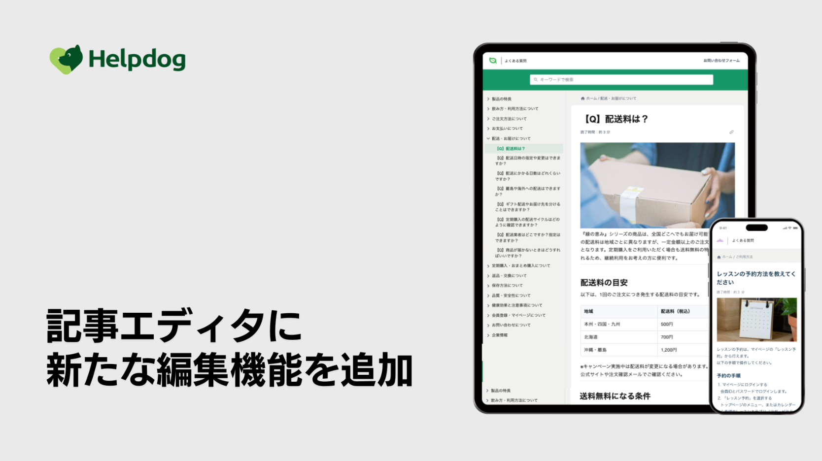 noco株式会社(本社:東京都中央区、代表取締役:堀辺 憲)は、このたび、AIサポートシステム「ヘルプドッグ」(https://helpdog.ai)において、FAQサイトの記事エディタへ「補足ブロック(コールアウト)」および「折りたたみブロック(アコーディオン)」を追加するアップデートを開始しました。