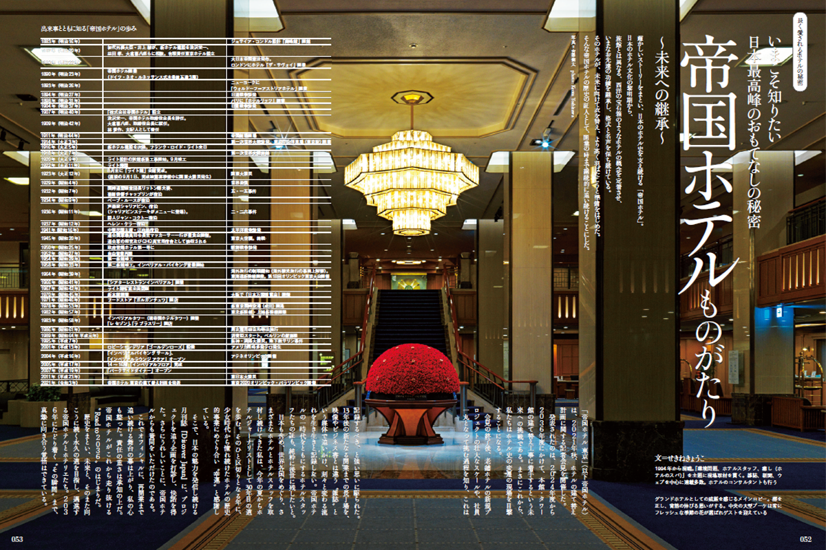 日本の迎賓館として日本のホテル文化をけん引してきた「帝国ホテル」。帝国ホテルのおもてなしを支えてきたレジェンドたちへのインタビューや、2036年の新本館誕生に向けてプロジェクトについて紹介。また今年は、近代建築の巨匠・フランク・ロイド・ライトが手掛けた2代目本館の100周年でもあり、ライトと帝国ホテルについての記事も収録しています。多くのホテルが誕生しているいまだからこそ知っておきたい、メイド・イン・ジャパンのホテルだからこその魅力と可能性を紐解きます。