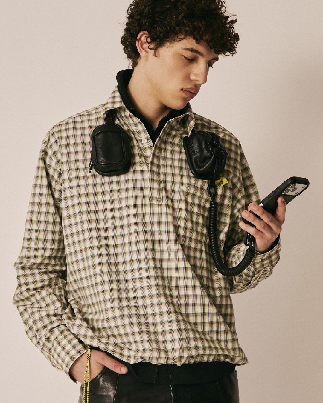 ボディ前面には、MagSafeを活用してiPhoneケースを外付けできる構造を採用。コイル巻きのコードとiPhoneケースをカラビナで連結し、さらにMagSafeでバッグ本体に固定することで、デバイスとの一体感を生み出します。