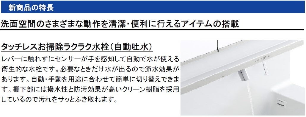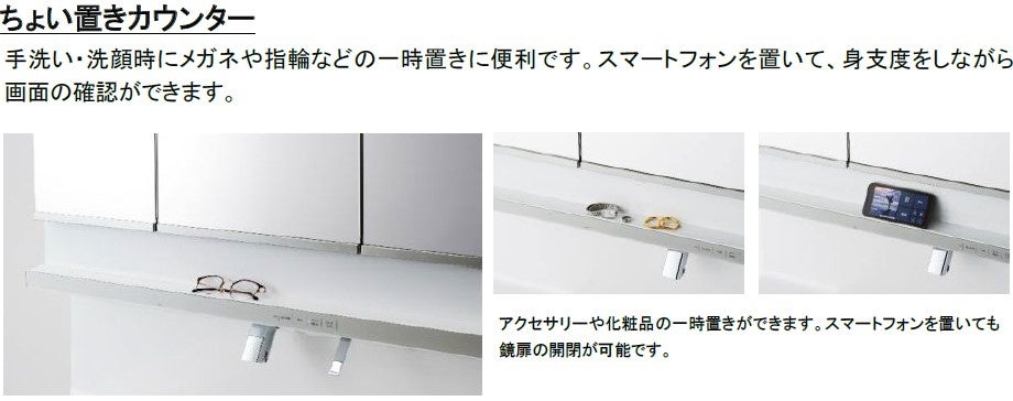 今回フルモデルチェンする「オクターブスリム」では、手を触れずに操作できる「タッチレスお掃除ラクラク水栓(自動吐水)」「タッチレスワイドLED照明」や「きれい除菌水」*を新搭載し、清潔できれいが続く洗面空間をご提案します。さらに身支度の時間を快適にお過ごしいただける「ちょい置きカウンター」を搭載します。スマートフォンや腕時計などの小物を一時的に置ける便利なアイテムです。