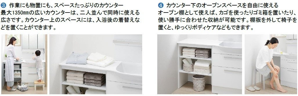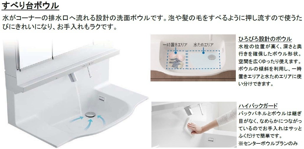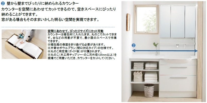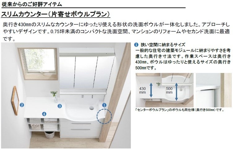 定番の「センターボウルプラン」に加えて「片寄せボウルプラン」の2プランを品揃えしています。「片寄せ ボウルプラン」は、空間にあわせてぴったりサイズにカウンターをカットできるので、マンションのリフォームやセカンド洗面に最適な商品です。作業にも物置きにも使えるスペースたっぷりのカウンターは奥行き 430㎜、洗面ボウルは広くゆったり使える奥行き500㎜で使いやすさにこだわった洗面化粧台です。