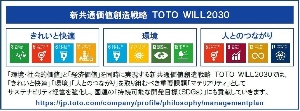 TOTOは、「きれいと快適」「環境」を両立するTOTOらしい商品を「サステナブルプロダクツ」と位置付け、これらの商品を普及させることによって、地球環境に配慮した、豊かで快適な社会の実現に貢献していきます。
